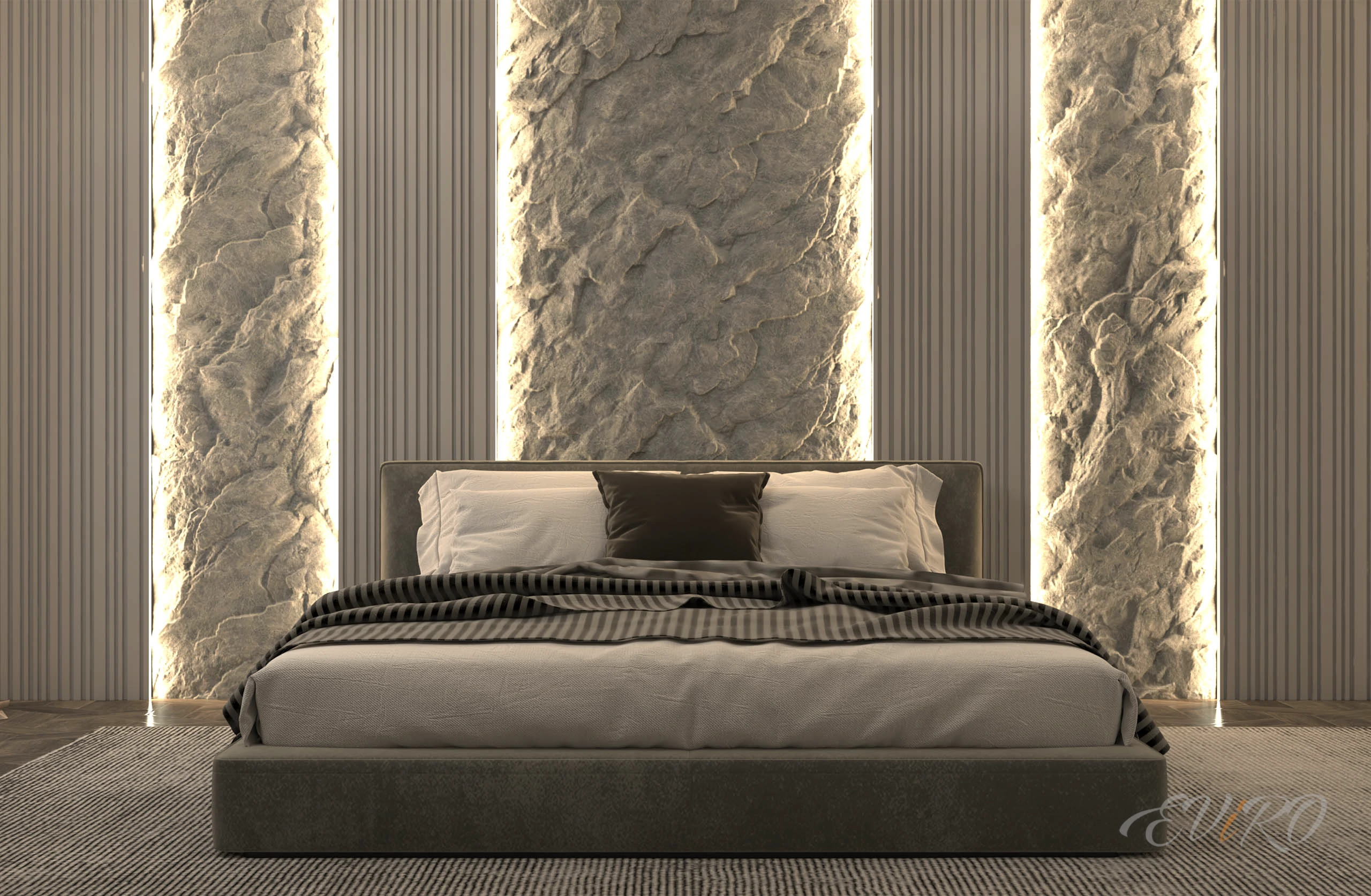 Создание изголовья кровати – это искусство преображения спальни, требующее тонкого чувства стиля. Современным холстом для самовыражения становятся дизайнерские 3D панели, способные вдохнуть жизнь в пространство. Здесь, в симфонии текстур и света, гипсовые 3D панели EViRO Barcode и EViRO Exclusive Rock сплетаются воедино, а подсветка, словно нить Ариадны, пронизывает торцы реечных панелей, создавая завораживающий эффект.