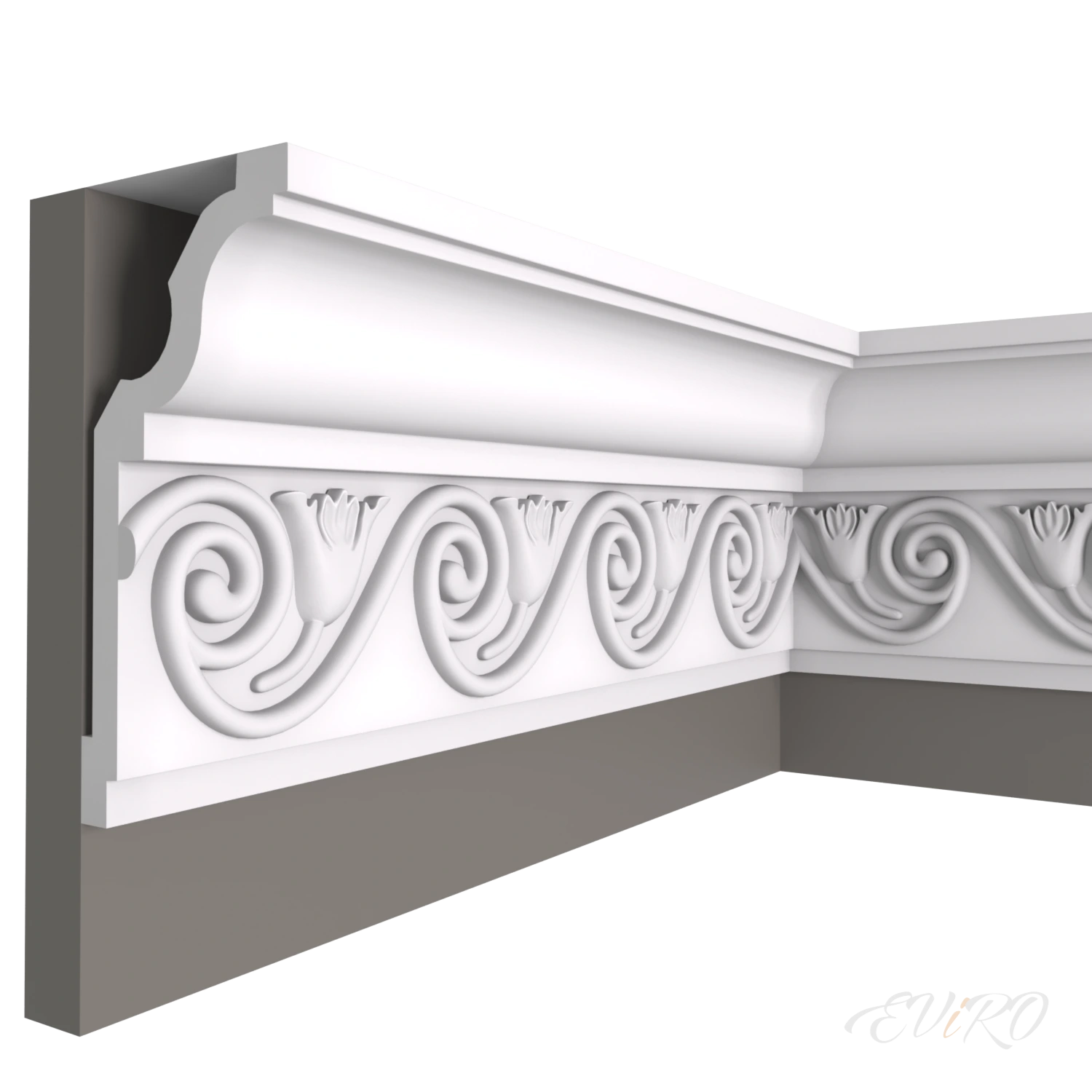 Специалисты компании ЕВиРО с большой ответственностью подошли к создаваемым моделям гипсовых карнизов с орнаментом, каждая модель неповторима и по-своему уникальна. Материал, из которого изготавливаются карнизы фабрики ЕВиРО, скульптурный гипс, армированный стеклофиброволокном, является экологически чистым, не горючим, влагоустойчивым, а так же прочным и долговечным. Карнизы ЕВиРО из скульптурного гипса могут быть окрашены в любой цвет, а так же могут быть отделаны с эффектом серебра, золота, стали, дерева и другого декоративного напыления. Гипсовые карнизы ЕВиРО совмещают в себе красоту и надежность. Применение карнизов ЕВиРО в интерьере обеспечивает определенный шик и уют.